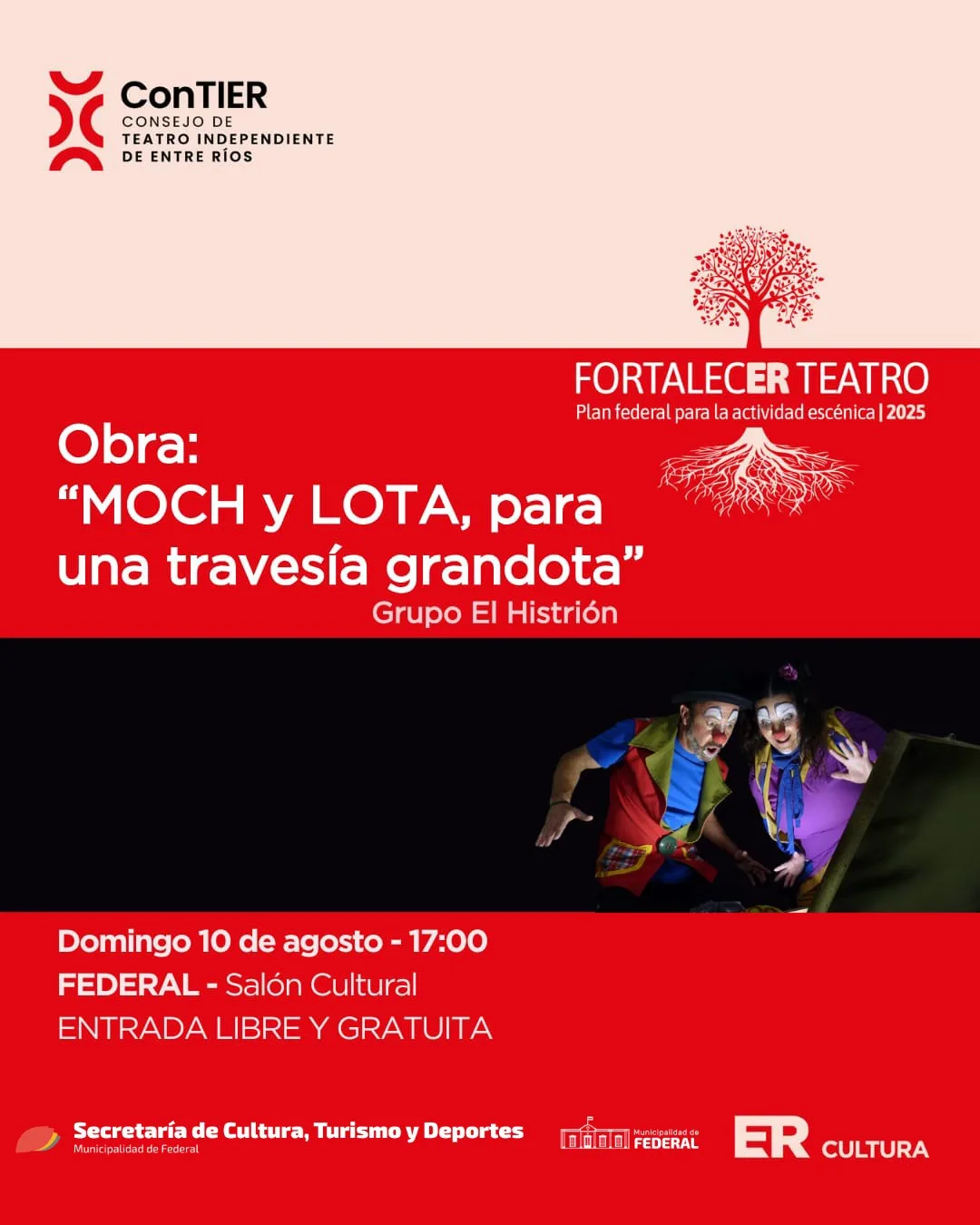 El próximo domingo 10 de agosto, a las 17:00 horas, se presentará en el Salón Cultural de Federal la obra «MOCH y LOTA, para una travesía Grandota», a cargo del grupo El Histrión. La función se enmarca en el Plan Federal para la Actividad Escencial 2025, con el objetivo de fortalecer el teatro como herramienta de transformación, encuentro y comunidad.