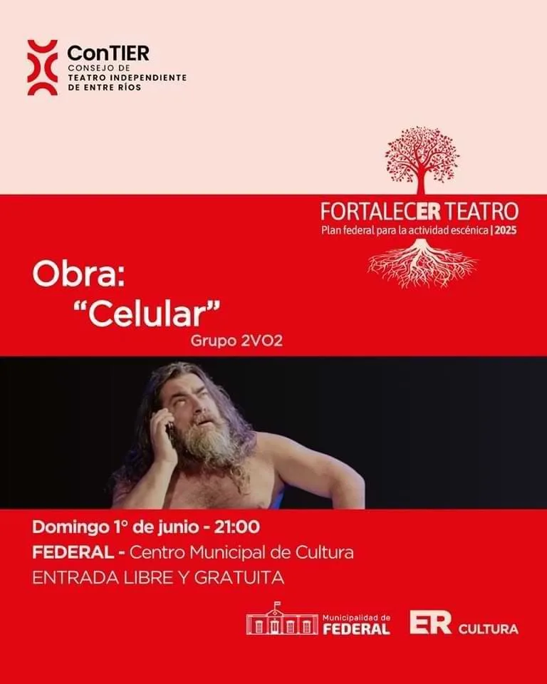En el marco del plan federal “Fortalecer Teatro 2025”, llega a Federal la obra “Celular”, del grupo 2VO2, con entrada libre y gratuita.